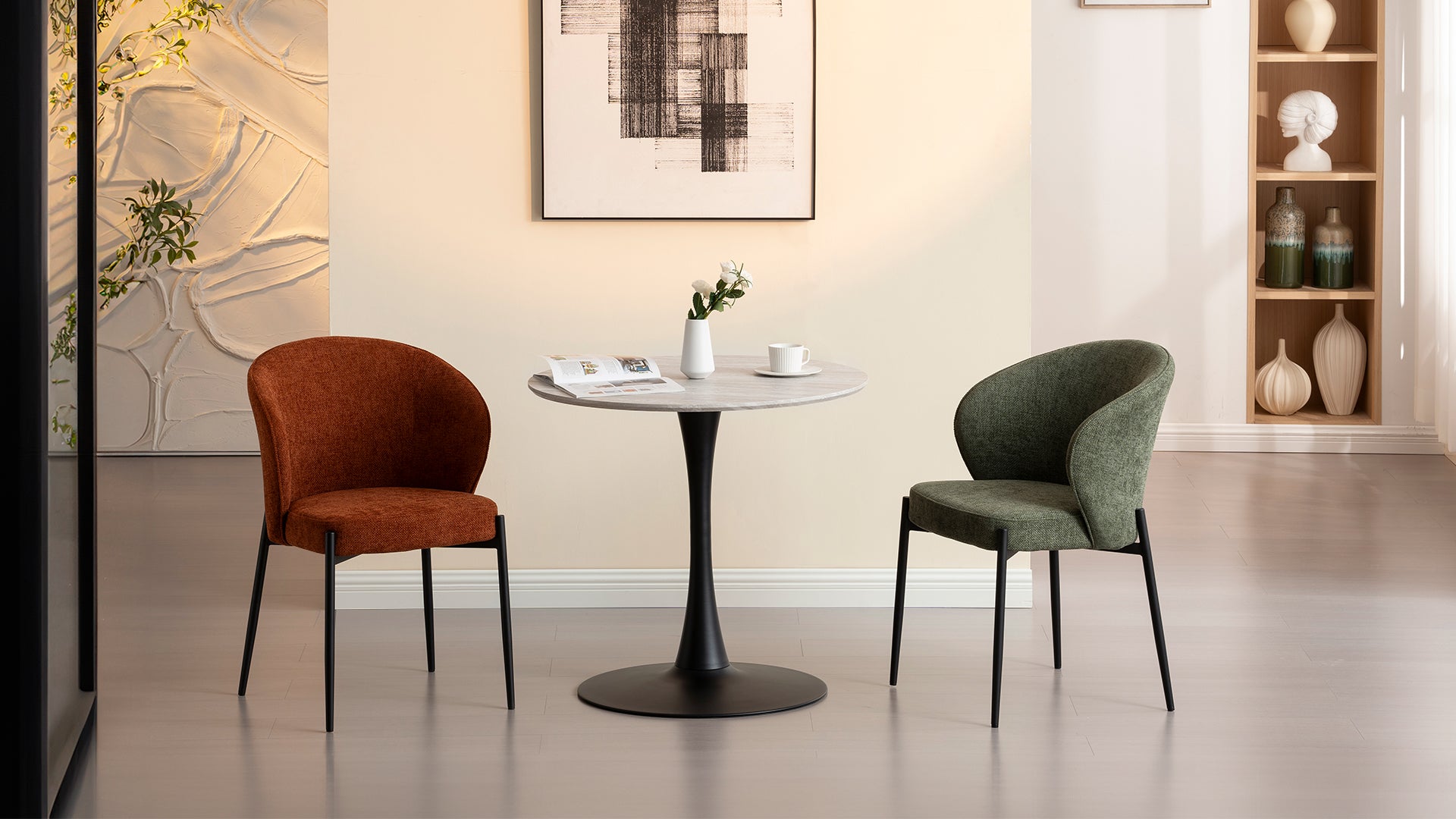 Completa tu espacio con los sillones Bard. Su diseño con respaldo medio alto y amplio asiento tapizado invita a disfrutar de largas y agradables conversaciones después de cada comida. La estructura sólida y las líneas contemporáneas del Bard armonizan a la perfección con la estética nítida de la mesa Tiana, creando un conjunto visualmente cohesivo y tremendamente atractivo.