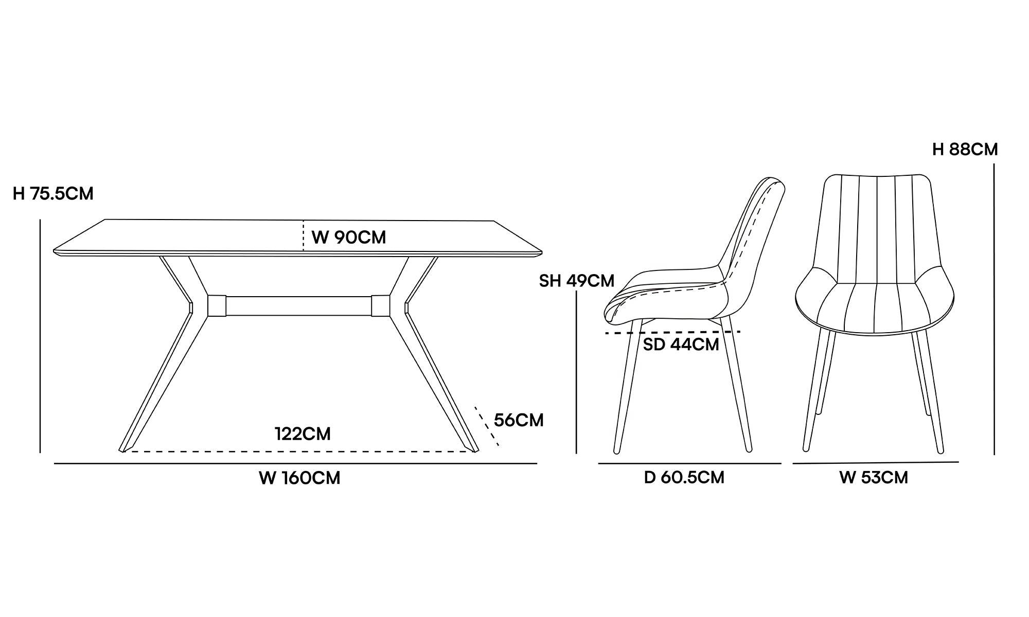 Mejora tu experiencia gastronómica con la mesa de comedor rectangular Laila (160 cm x 80 cm) y las 6 sillas de comedor Jarvis: una combinación perfecta de estilo, comodidad y funcionalidad.
