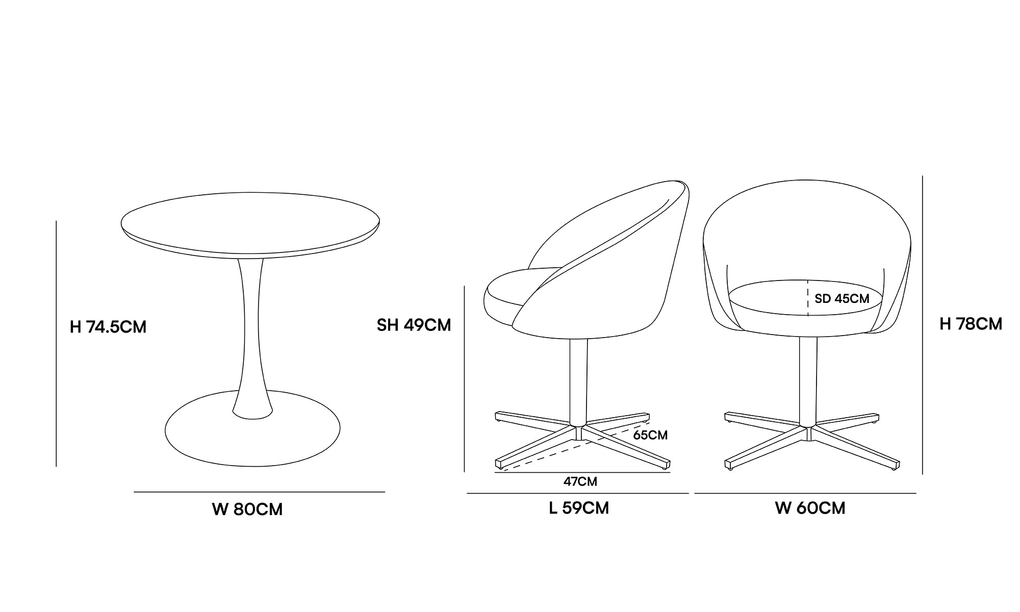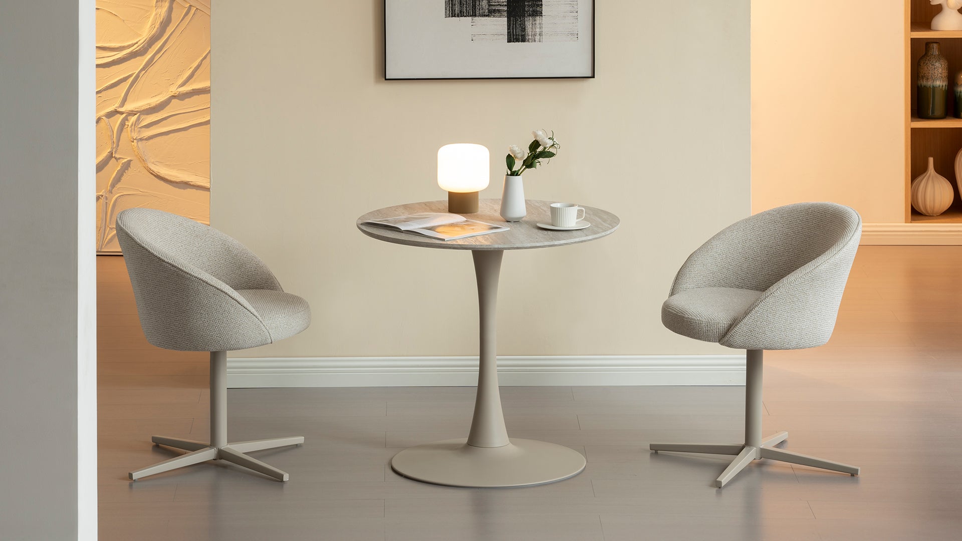 Acompañamos la mesa con dos de nuestros Sillones Giratorios Paislee. Su diseño con asiento giratorio 360º no es solo un detalle divertido, sino un plus de funcionalidad, facilitando la conversación y el movimiento. Tapizados en una elegante tela de lino, ofrecen una comodidad excepcional y una textura que invita al tacto. Son el complemento ideal para relajarse después de una buena comida o para disfrutar de una agradable conversación.