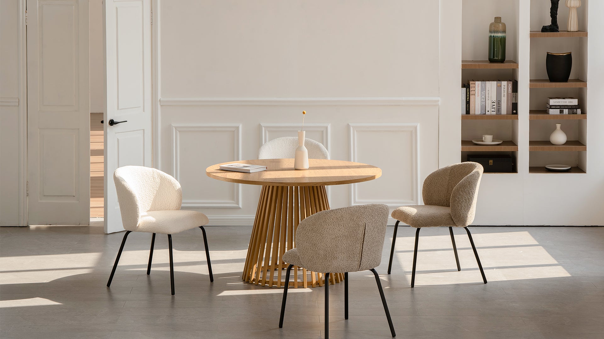 Este acabado imita el aspecto de la madera real, con la durabilidad y asequibilidad del MDF. Las sillas de comedor están hechas de tejido bouclé, lo que proporciona una experiencia de asiento cómoda, duradera y resistente. Complementa un ambiente hogareño tranquilo y acogedor.