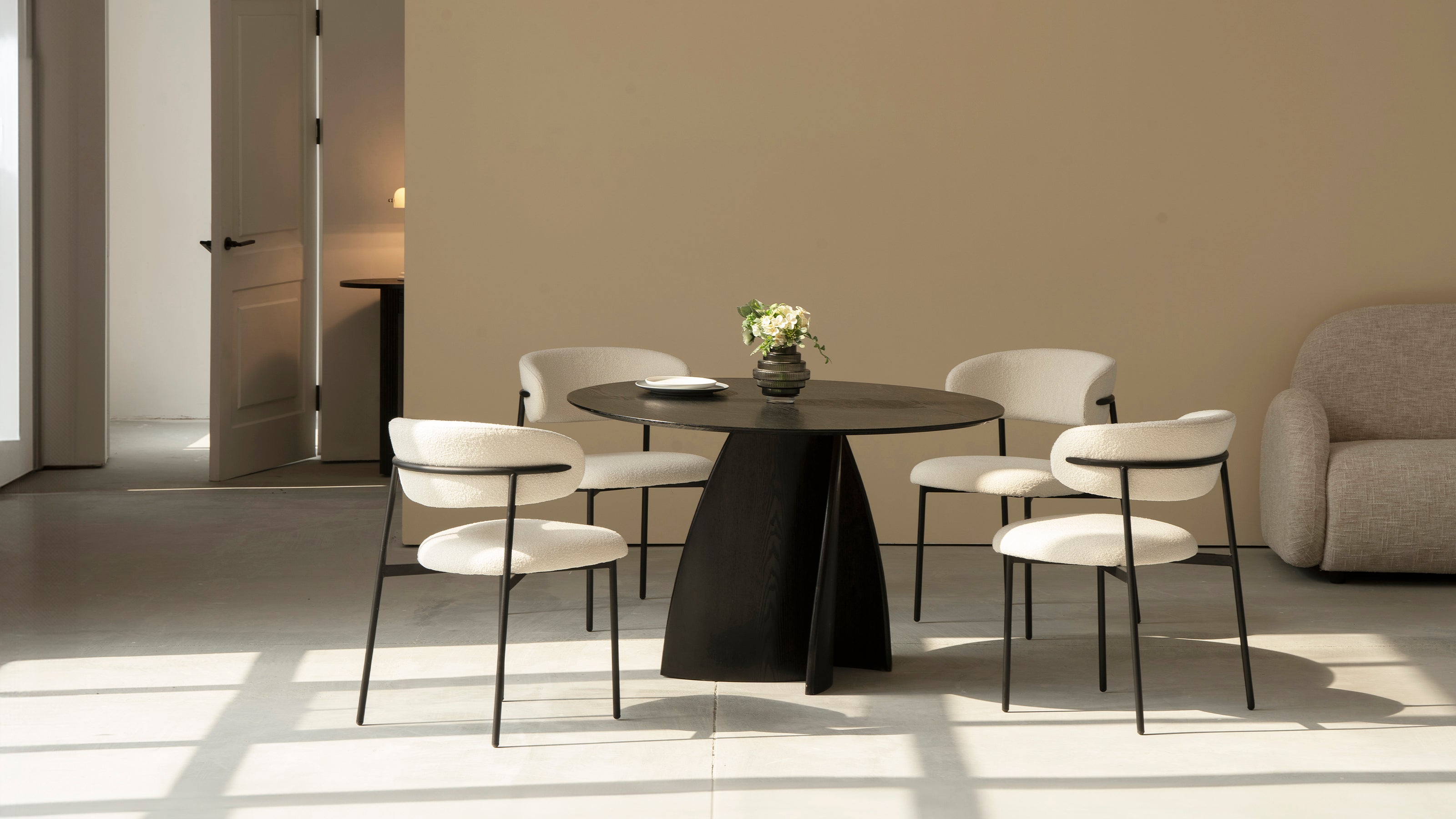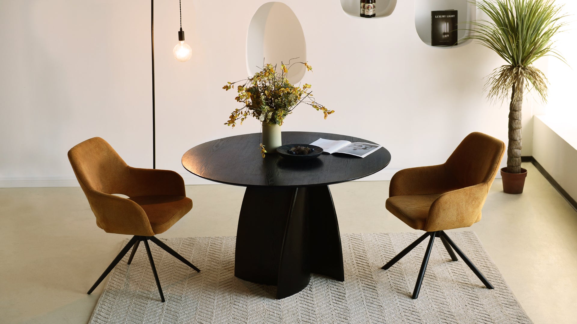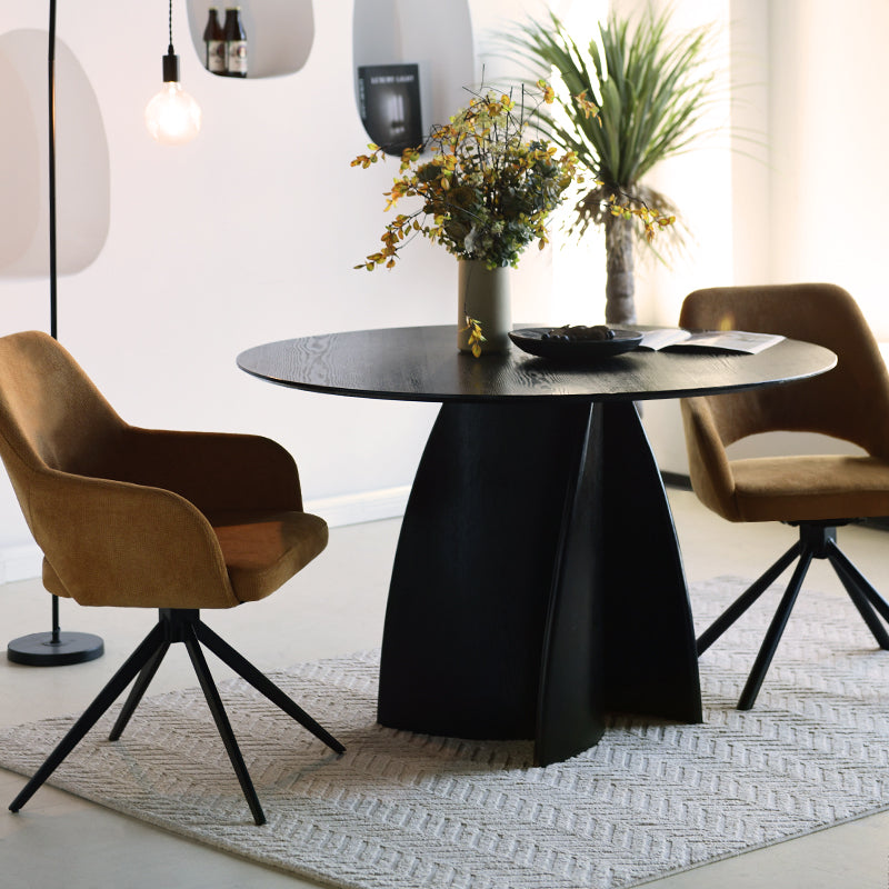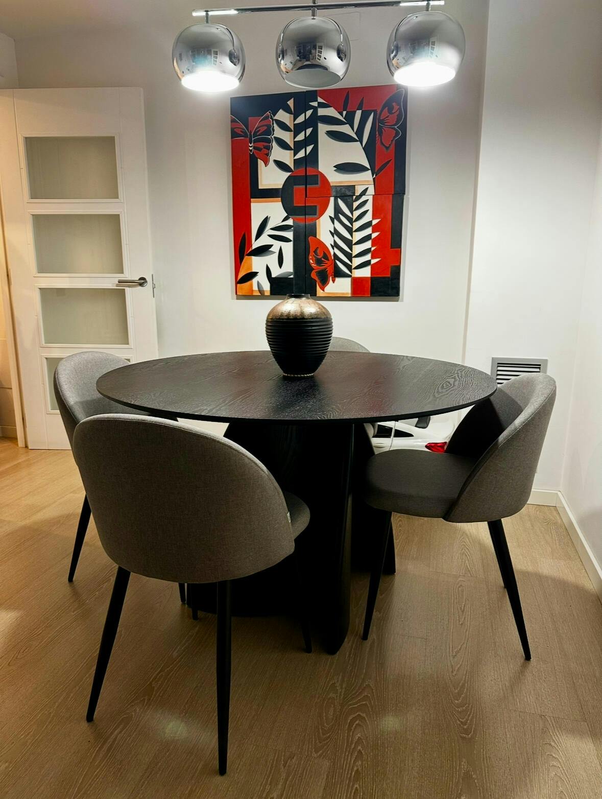 Marca un impacto con la mesa redonda Gemma, acabada en un intenso chapa negra que eleva instantáneamente cualquier comedor o espacio abierto. Su generoso diámetro de 120 cm ofrece amplio espacio para cuatro comensales, mientras su silueta curva se integra perfectamente tanto en apartamentos urbanos modernos como en cocinas rústicas de inspiración escandinava.