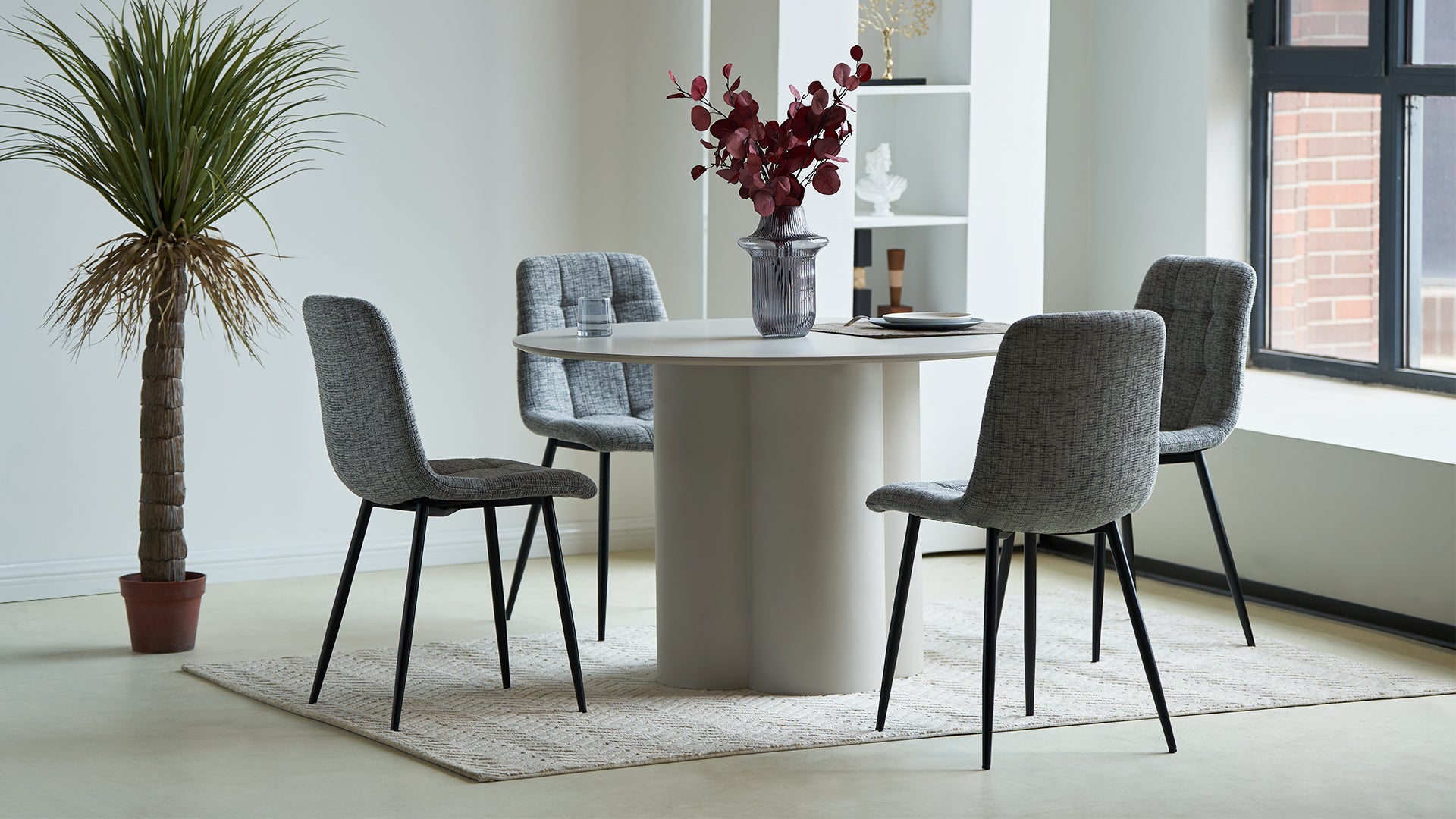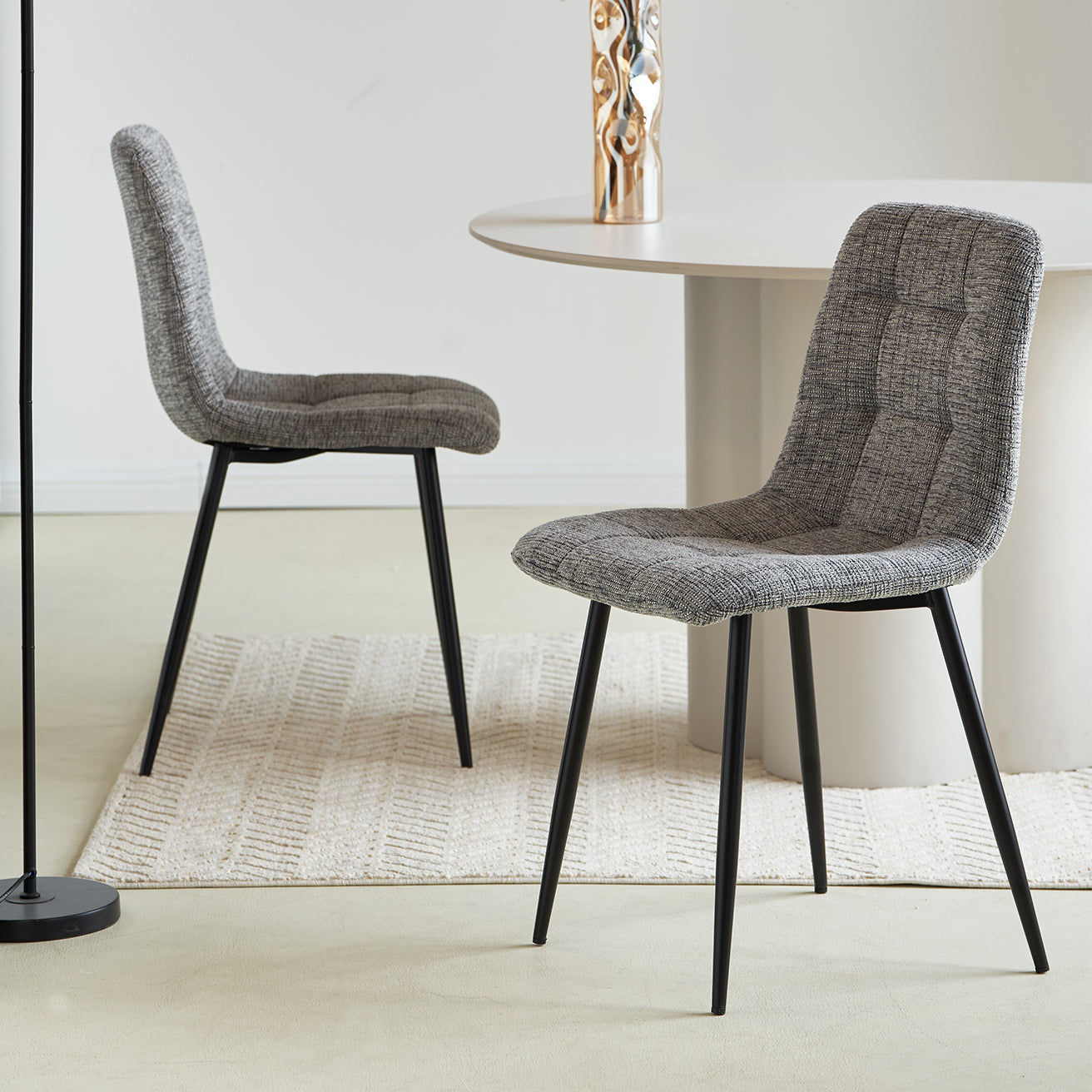 Las Sillas Aoife combinan encanto natural y corte moderno con su tapizado transpirable de mezcla de lino y acolchado en cuadrícula diamante de precisión. Los reposabrazos ligeramente acampanados y el respaldo suavemente curvado ofrecen un ajuste ergonómico acogedor, manteniendo un aspecto limpio y contemporáneo.