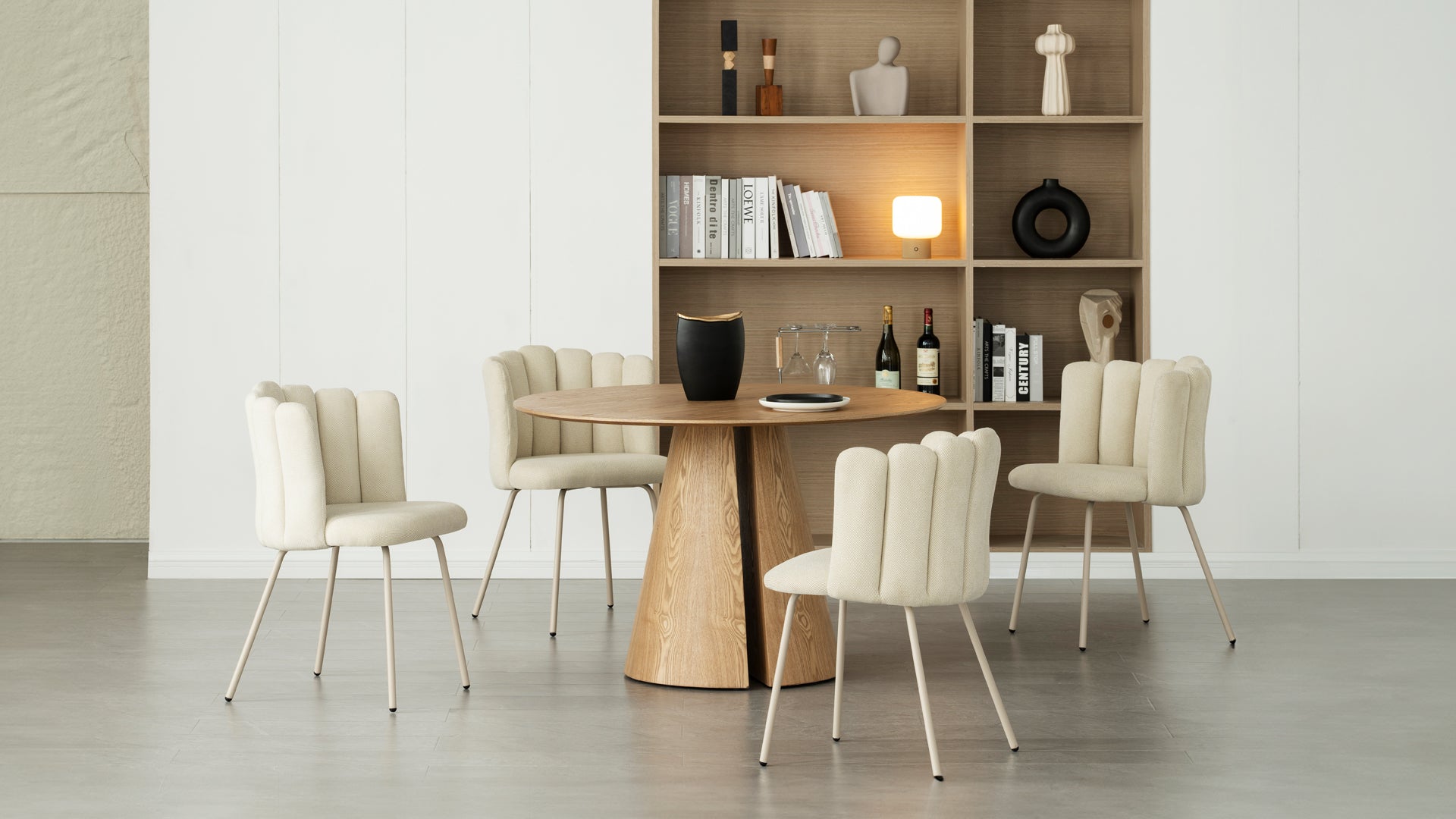 Los tonos claros de Grove le permiten combinarse fácilmente con mesas de madera, mármol o metal. Ya sea en comedores o como pieza de acento, encarna una sofisticación atemporal. Un fiel reflejo del confort moderno, Grove transforma el simple acto de sentarse en una experiencia de gracia natural.