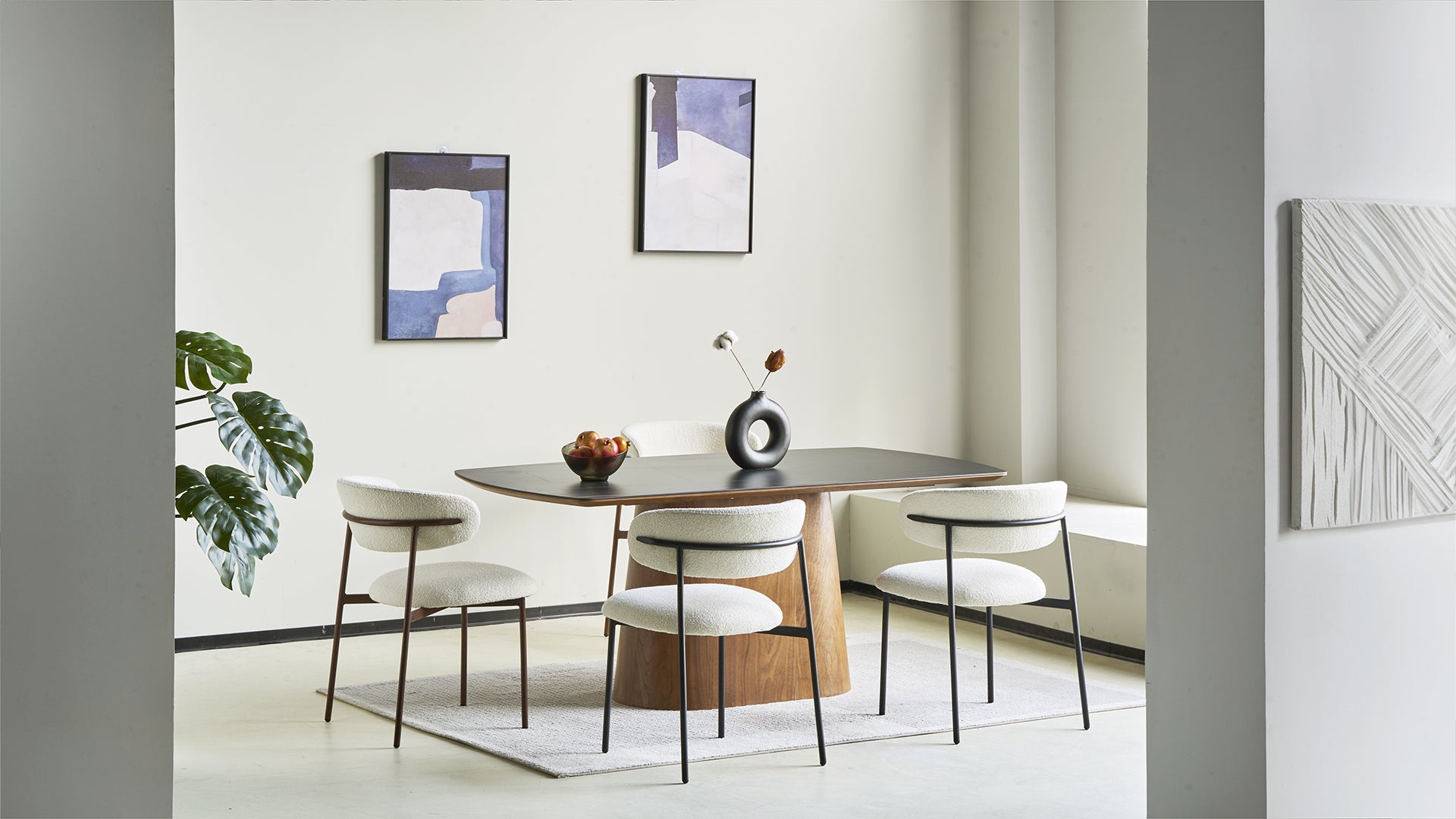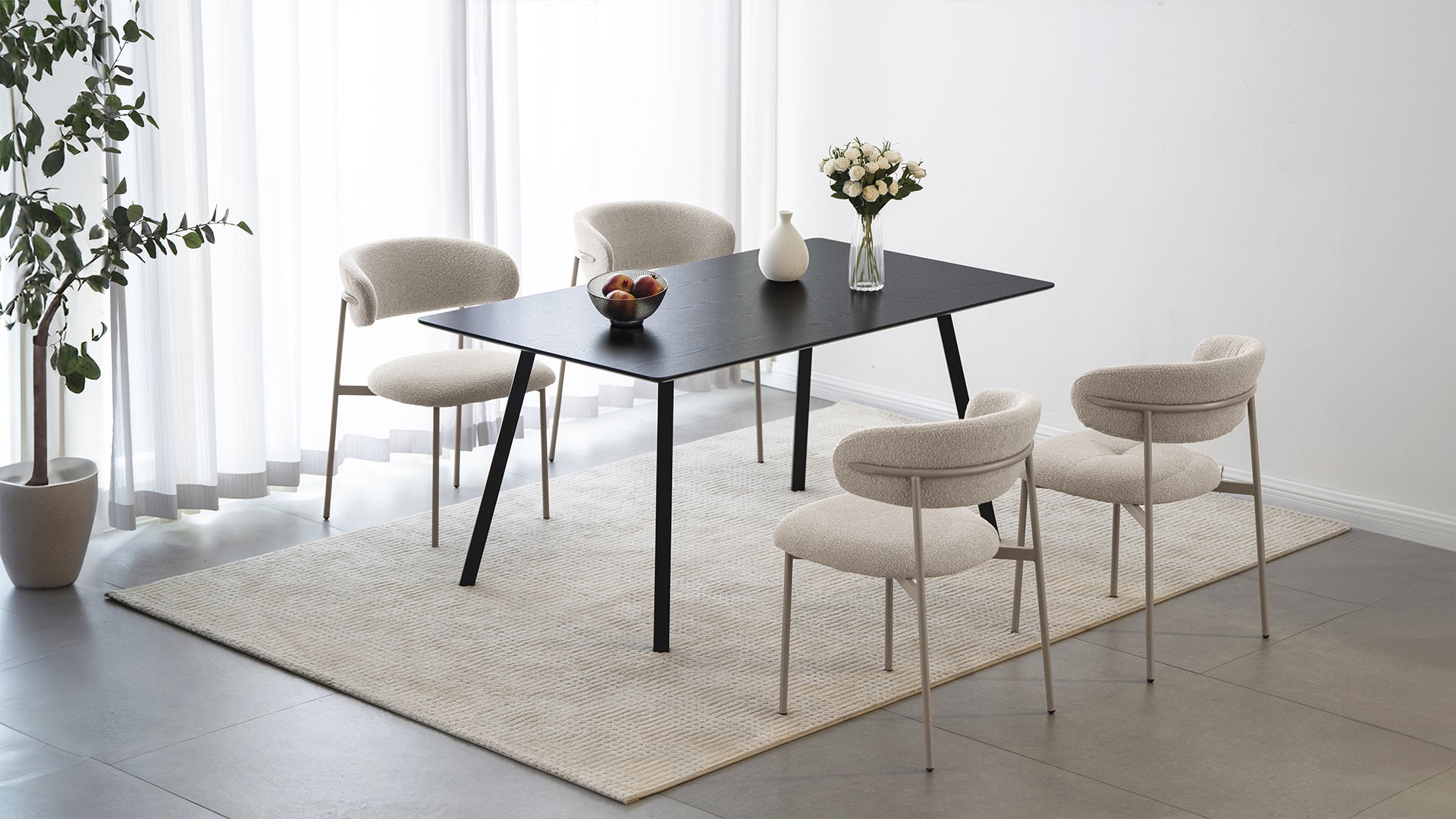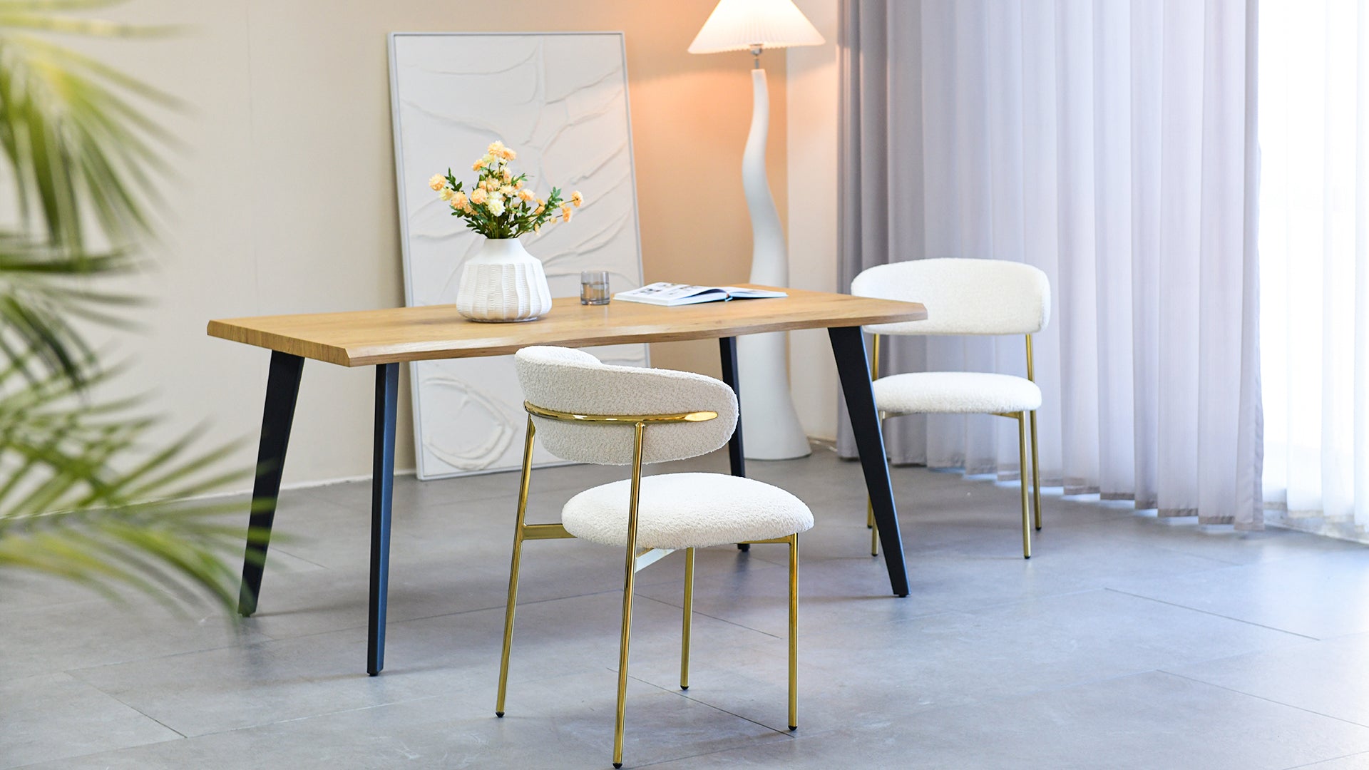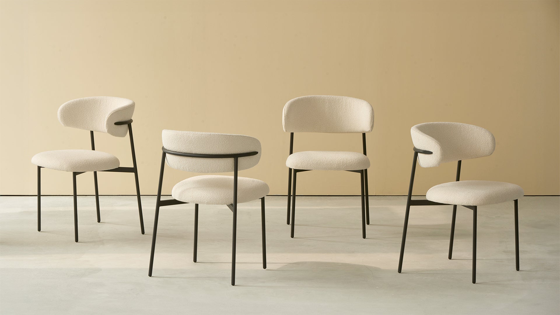 Envueltas en un suave tejido bouclé, estas sillas añaden un toque cálido a cualquier espacio, ya sea un piso urbano o una acogedora casa de campo. Sus asientos mullidos y respaldo ligeramente curvado ofrecen un confort envolvente, perfecto para cenas familiares o charlas nocturnas.